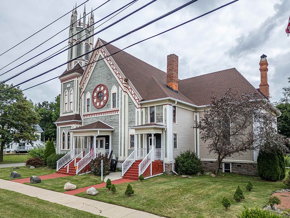 Well over 6884 of square footage!! Historic 19th Century Church Conversion Renovated with Modern Upgrades Step into a stunning piece of Michigan history with this beautifully remodeled former church, originally built in 1872. Featuring a bell tower with the original date stamped on the bell, this unique property blends timeless architecture with contemporary comfort. Recent Renovations Include: Brand new roof and eaves Upgraded front double doors new sewer line installation new water heater Select new windows, including a custom stained glass window Tile flooring in the lower-level Updated ceiling lighting throughout Partial new siding (additional siding will be left on the property) Interior Highlights: The lower level offers a spacious living area with four bedrooms, a modern kitchen with granite countertops, ceramic tile floors cherry cabinetry, a dining room a pantry and stainless-steel appliances. There is a back porch entrance and a fenced yard. Main Floor is on the front of Main Street and has double entrance door up a set of stairs. A breathtaking 37 x 49 great room with soaring cathedral ceilings and original stained-glass windows—perfect for entertaining, creative use, or even a dramatic man cave. Zoning & Potential: Currently zoned residential, but easily convertible to commercial use, offering endless possibilities for live/workspace, studio, gallery, or boutique business. Schedule a Showing: Don’t miss your chance to own this rare and remarkable property. Call today to arrange a private tour and experience the charm and character of this historic gem.