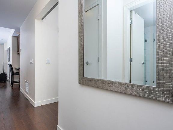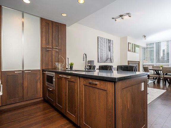 In the heart of downtown Calgary, Waterfront is an exclusive condo building located in the elite Eau Claire neighbourhood. This upscale 2 bedroom 2 bathroom unit comes complete with a gourmet kitchen, in-suite washer & dryer, climate control heating/air conditioning, dishwasher, microwave, balcony and is pre-wired for cable and high-speed Internet access. There are rich mahogany hardwood floors and cabinetry and floor-to-ceiling windows that allow the sun to pour in throughout the day.