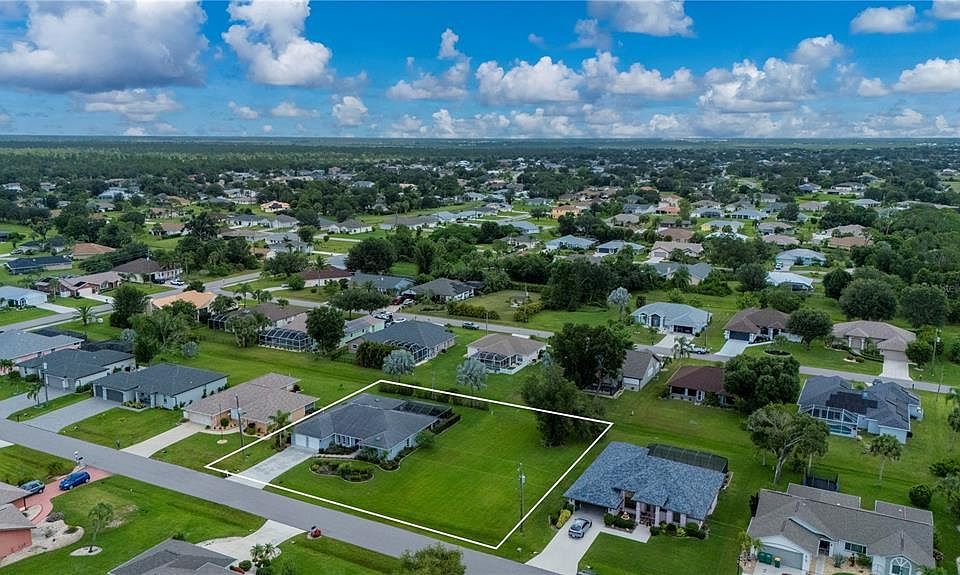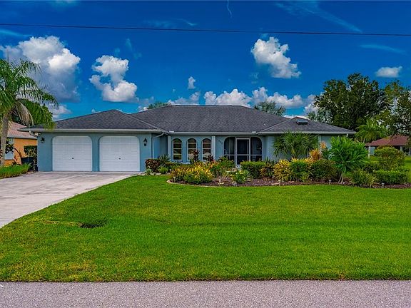 Sunlight streams through skylights overhead, dancing across porcelain tile floors and reflecting off quartz countertops-a gentle reminder that this is no ordinary Florida home. Here, country charm and coastal cool converge in a beautifully balanced 3 bedroom, 2 bath pool home with flexible living spaces, spa-level finishes, and a sense of peace that’s hard to find. Located on a quiet cul-de-sac in Deep Creek, this home offers both privacy and possibility-starting with an additional cleared, buildable lot included in the sale. Whether you envision a lush garden retreat or a future guest home, the canvas is ready. Inside, the layout flows with ease. The kitchen is a statement piece-warm and grounded with a brick accent wall, shaker cabinetry, and rich quartz surfaces. Plank-style floors tie it all together, creating a space that’s as functional as it is inviting. Pocketing sliders open the living room to the lanai, expanding the home's footprint and inviting the outdoors in. The master suite is generously sized and calming, with its own access to the pool and a beautifully updated bath-featuring a freestanding soaking tub, stone accent wall, and spa-inspired finishes. Just off the foyer, a barn-door-enclosed study offers the perfect work-from-home setup or an easy conversion into a fourth bedroom. Both guest suites are privately situated, each with walk-in closets and a tranquil vibe of their own. The guest bath-complete with a furniture-style vanity and granite top-also serves the pool area with convenient access. Step outside and you’ll feel like you’re on vacation. The lanai is designed for both relaxation and celebration, from the sparkling pool and paver decking to the tiki hut that sets the scene for laid-back evenings or lively gatherings. Mature landscaping surrounds the space, maintained by a private irrigation well and supported by a 4x12 storage shed for all your outdoor essentials. Hurricane accordion shutters offer added protection, so you can relax no matter the season. This home is meticulously cared for, full of character, and ready for your next chapter to begin.