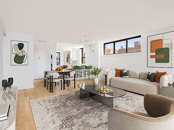 The building provides a full-time 24-hour doorman, live-in resident manager, multiple porters, a package room, laundry facilities with new commercial washers and dryers, a windowed gym with new equipment, and direct access to a connected garage. Pets are welcome.