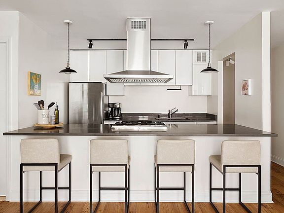 The kitchen flows naturally into the living area, where you will find a sizable alcove perfect for a work from home office nook, generous space for an L shaped couch, and dining room area. The two main living windows provide direct northern exposure and flood the apartment with natural light. Additionally, you will find a large closet providing wonderful storage. Next to the closet is a refurbished and updated bathroom consisting of a granite vanity.