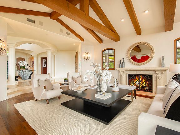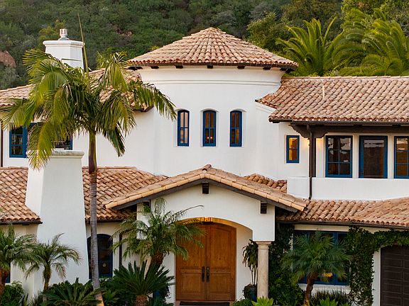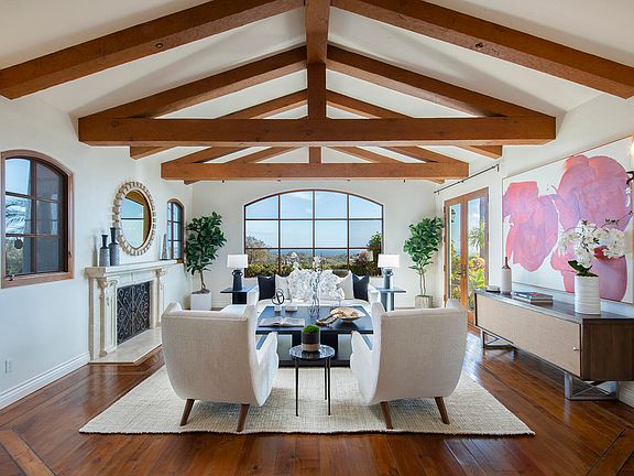 Stylish and sophisticated, this gated Mediterranean villa offers incredible privacy and breathtaking ocean and island views just minutes from Montecito's Upper Village. Set on 2.5± acres, the home is designed to harmonize with its natural surroundings with views from every living space, indoors & out. The transformed interior includes separate living and family rooms, formal dining, an artisan kitchen, & downstairs office. Upstairs, an elegant primary & sitting room + luxe bath, & 2 ensuite bedrooms all have ocean view balconies. Resort-like grounds boast a 1 BR guest house, a tropical pool & spa, a 5-hole putting green, and manicured garden paths. Solar panels and a shared well assist with utility costs. This is an unsurpassed retreat for those seeking the best of Montecito living.
