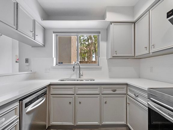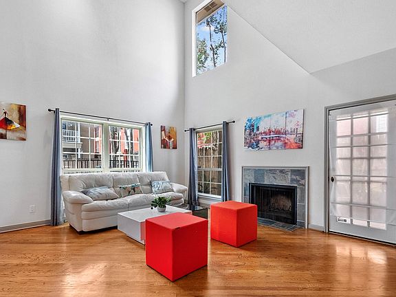 Soaring ceiling in the living room and skylight offer natural light. Both bedrooms are upstairs. Spacious primary bedroom features library/study area and en suite shower, and walk-in closet. Secondary bedroom is generously sized with walk-in closet and en suite bath. Additional closet space off upstairs hallway. Large two-car attached garage with storage closet. Washer and Dryer included for an easy move-in.