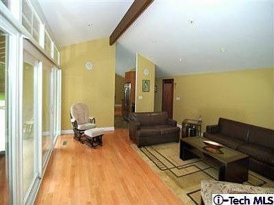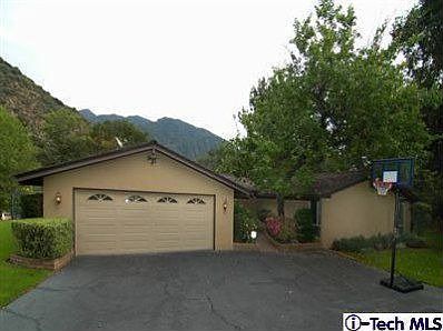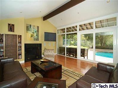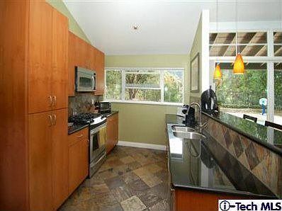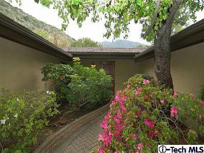 Majestic canyon views are the backdrop for the pool, spa and patio, perfect for outdoor California living. The outdoor speaker system will only add to the enjoyment of this fantastic backyard. Located high up in the hills of Arcadia, in the Highland Oaks area, this updated home has it all. The large living room has a remote control gas fireplace and a 52'' flat screen TV with surround sound (all of which is included) The patio can be accessed through the sliding glass doors, part of a wall of glass so that the views can be enjoyed from inside too. The modern kitchen has stainless steel appliances which include the refrigerator and beverage frig. The kitchen also has granite counters and a slate floor and backsplash. A breakfast bar separates the kitchen from the airy dining area. The dining area also has a wall of glass with a door that leads to the backyard. Window coverings include custom blinds and shutters. The master bedroom has its own bath with large jet tub.