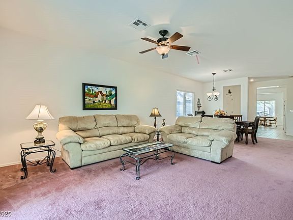 Check out this lovely home in the desirable 55 plus Sun City Aliante Community with majestic mountain views and located on the 12thh hole of the golf course. Features include a large dining/ living room, kitchen with a sunny breakfast nook, Corian counters, tile floors and pull out cabinet shelves. The primary bedroom is separate from the other 2 bedrooms and offers a walk in closet, primary bath with double sinks and step in shower. Original owners second home. New HVAC installed three years ago. Amenities include community activities, public transportaion, Aliante Casino, shopping, dining and more.