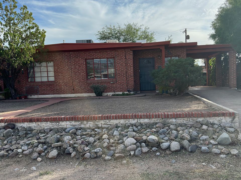 There is a covered carport. There is a large walled yard with mature trees and a covered back patio. A well behaved pet is allowed.