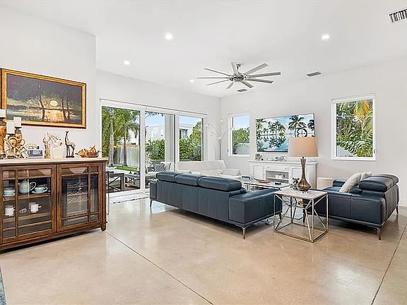 Open-concept layout featuring polished concrete floors and expansive floor-to-ceiling windows that flood the home with natural light