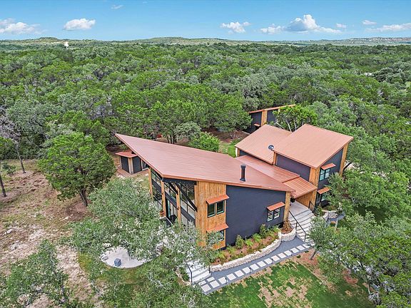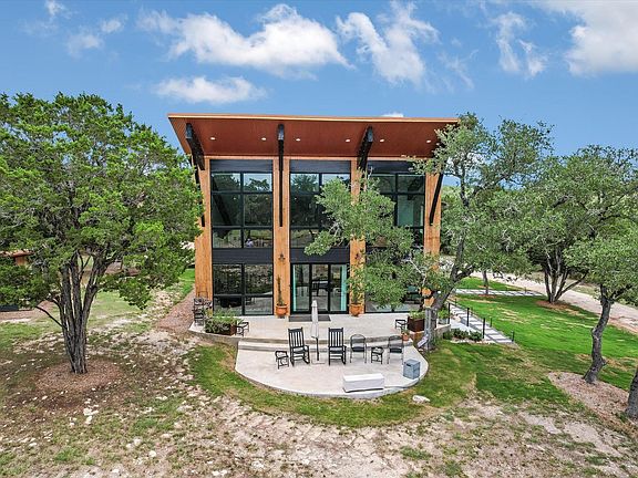 Contemporary home on 14.7 with Big Views, Garden, Office Space & RV Hookups — No Deed Restrictions and a wildlife exemption in place for very low taxes. If you’re looking for wide-open space, modern comfort, and the freedom to make a property truly your own, this 14.7-acre Hill Country retreat might be exactly what you’ve been waiting for. With no deed restrictions, it’s an ideal setup for a short-term rental, full-time living, or a private getaway with room to expand. The home features a clean, modern design with warm wood and metal accents throughout. Oversized windows in the living room offer sweeping 180-degree views of the surrounding hills — views you can enjoy from inside or while relaxing on the spacious front porch. Just steps away, a detached two-car garage includes a finished office space — perfect for remote work, creative projects, or guest overflow. Green thumbs will love the large raised-bed garden, complete with its own garden shed for tools and supplies. Tucked farther back on the property is a dedicated RV pad with 50-amp service, water, and its own septic connection — a rare and valuable feature. The current RV on site is also available for purchase separately, making it easy to move right in or offer additional rental space right away. Whether you’re looking to build a short-term rental business, a multi-use homestead, or simply a peaceful place to enjoy the land and views, this property offers flexibility and charm in equal measure — all just a short drive from Wimberley.