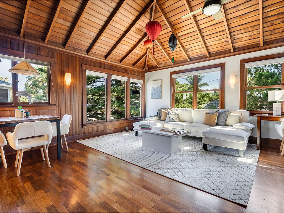 Open airy layoutUpdated kitchenExposed beam ceilings