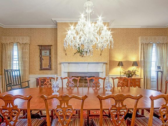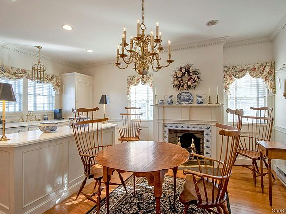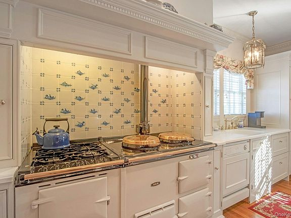 As you enter though the wide center hall, to one side is the living room, with custom-crafted archways over the windows and a warming fireplace. This leads into the adjoining sitting room with another gas fireplace. Across the hall is the banquet-sized formal dining room with the third fireplace and featuring an exquisite 12-arm custom Waterford chandelier. From here you enter the eat-in kitchen featuring the immense and warming AGA cast iron cooker and the fourth gas fireplace.