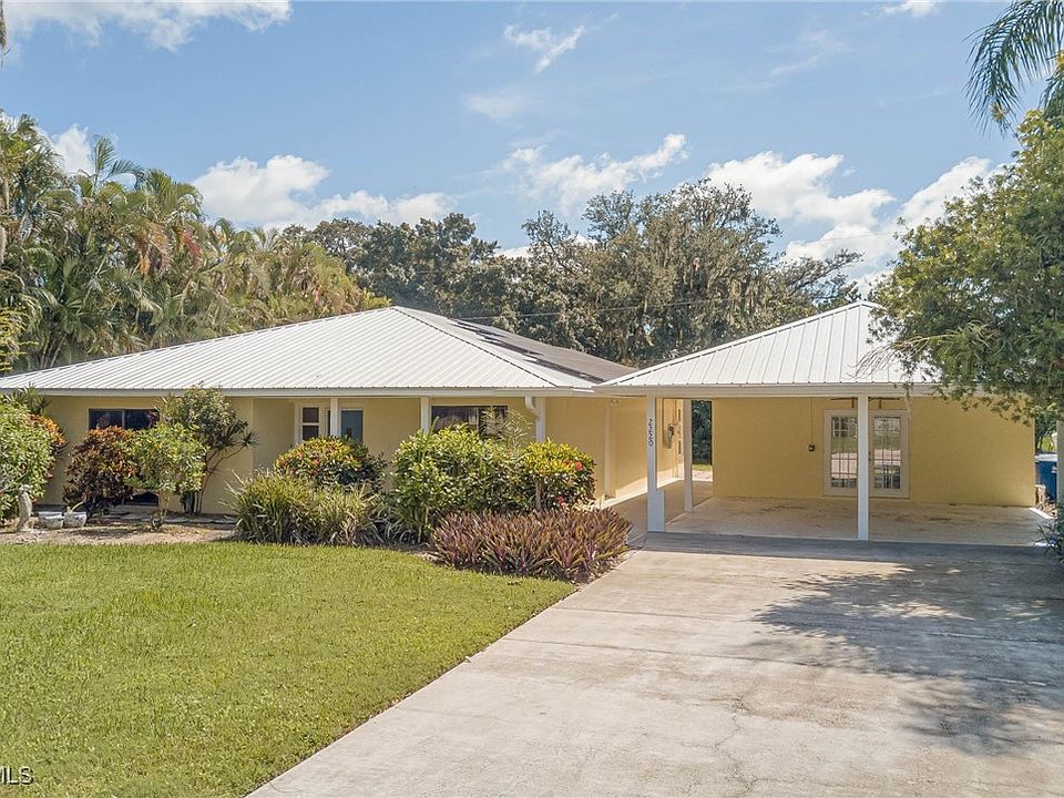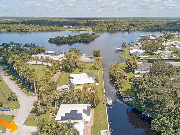 Welcome to 2220 Violet Dr – a move-in ready waterfront gem in sunny Southwest Florida! This beautifully updated 3-bedroom, 2-bath concrete block home offers 100 feet of peaceful canal frontage just two houses from the Caloosahatchee River, providing direct, unencumbered access to the Gulf of Mexico and even the Atlantic Ocean via Lake Okeechobee. Light and bright interior with a spacious split floor plan, large bedrooms, walk-in closets, and two full bathrooms. The kitchen features butcher block countertops, white shaker soft-close cabinets and drawers, and newer white appliances. Enjoy sunrise coffee or sunset cocktails from your private dock, complete with a 4,000 lb boat lift, water and 240-volt electric hookups, and a solid dock wall. Major upgrades completed in 2024 include a new metal roof, new A/C, new water heater, and paid-off solar panels to significantly reduce electricity costs. The primary suite features sliding glass doors that open to your backyard oasis, with plenty of room to add a pool if desired. A large 320 SQ FT detached concrete block workshop/potential guest house and a 2-car carport provide ample storage and functionality. Nestled on a quiet, palm-lined street, yet only about a mile to Publix, shops, and dining—you get the best of both tranquility and convenience. Whether you're looking for a full-time residence or a weekend escape, this home offers the perfect blend of comfort, convenience, and coastal charm!