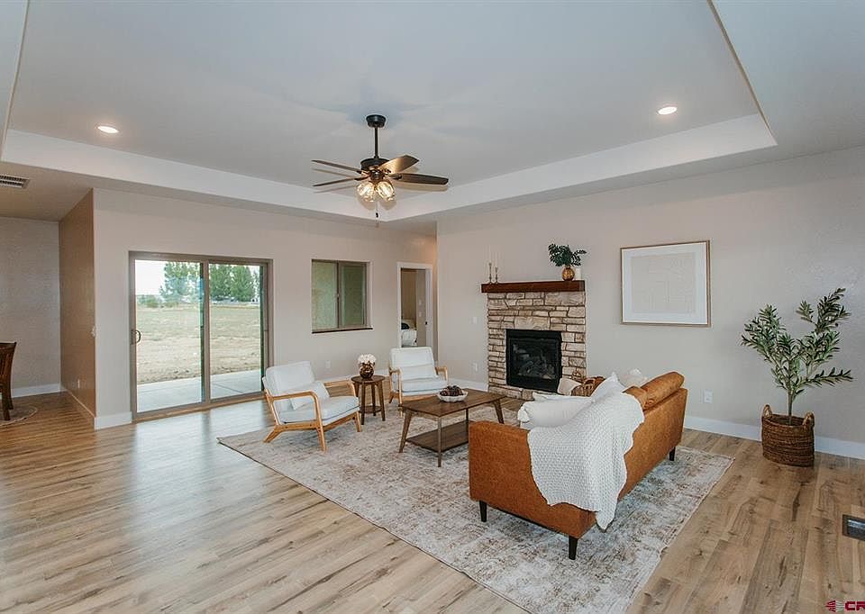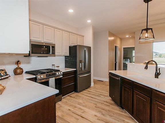 Welcome to your brand new home, perfectly situated 10 minutes south of Montrose with breathtaking mountain views and peaceful country living—ready for you to move in now! This spacious single-level home sits on a flat 1-acre lot and offers 3 bedrooms, 2 baths, and a thoughtfully designed split floor plan for optimal privacy and comfort. Step inside to a bright, open living space with an abundance of natural light, a cozy gas fireplace and both formal and casual dining areas. The custom kitchen features black stainless appliances, quartz countertops, abundant cabinetry, and a large built-in pantry—perfect for cooking and entertaining. The generous primary suite includes a tiled walk-in shower, dual vanities, a private water closet, and a walk-in closet that checks all the boxes. Enjoy durable vinyl flooring throughout the main areas, plush carpet in the bedrooms, and beautifully tiled baths. Additional highlights include a spacious laundry room with storage cabinets and a utility sink, a finished 3-car garage with epoxy floor and heater, forced air gas heat, and central A/C for year-round comfort. Outside, there’s plenty of room to build a future shop or detached garage, park your RV or boat, and enjoy the wide-open space. The property includes pressurized irrigation water via the HOA and is located on a paved road with high-speed Elevate fiber internet available—ideal for working from home or streaming. Don't wait for new construction—this move-in ready home has it all. Make this your next home today!