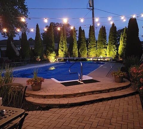 Fantastic home for PURE ENTERTAINMENT.Private Backyard Oasis, with 18X36 In-Ground heated pool, 8 Person Hot Tub, fully fenced with patio, shed, speakers and gardens. Formal Living and dining rooms, family room with fireplace and French door leading to patio. Kitchen w/double ovens, 4 burner cooktop w/downdraft, glass backsplash and solid surface counter tops and breakfast bar, and pantry. Finished rec-room, with 3 Person Sauna, and loads of storage. Massive Primary suite with WI closets. Whirlpool tub, tiled walk-in shower + Quartz dual sinks. Hardwood floors in kitchen, dining and living rooms. Glass Block windows in basement, 1st floor laundry. Situated between both walking and bike trails. Brand New CA, WASHER, AND DISHWASHER. Enjoy pool on these hot summer months. Huge Heated Garage