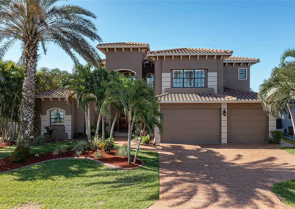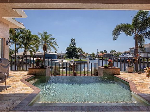 TWO-STORY STUNNER W/ALMOST IMMEDIATE SAIL ACCESS & SPECTACULAR CANAL VIEW! Make all of your dreams come true w/this showcase, 4 bed/4.5 bath plus unique bonus room/library, waterfront home in PGI w/85ft of seawall & lovely view of intersecting canals. Reach open water in mere minutes from your backyard. Gorgeous, 10' double mahogany doors greet you as you approach. Step inside to the spacious, formal living room w/gas fireplace. Enjoy views of the pool & canal from the moment you enter the home. Architectural details include porcelain tile floors w/marble inlays, beautiful travertine staircase w/wrought-iron railing, columns, decorative arches & a soaring 2-story ceiling in living room. A formal dining room leads to the chef-inspired kitchen & family room. Kitchen boasts granite counters, stainless steel appliances, wood cabinetry, a center island, breakfast bar & built-in wine refrigerator. Adjacent breakfast area & family room have fabulous pool & canal views. Family room, living room & master suite have walk-out access to lanai w/pool & canal views. Master suite, one guest room/study & a half bath are located on 1st floor. The large, master suite has two walk-in closets, private access to the lanai, pool & canal views & a spa-like master bath. 2nd floor offers 3 large bedrooms each w/private baths. Laundry room is conveniently located next to the master suite & doubles as a mud room w/access to the 3-car garage. Outside, the travertine paved lanai features an in-ground, infinity-edge, saltwater pool. Follow brick walkway to the 70' concrete dock w/NEW 16,000 lb boat lift & slide moors. Lift was added in late 2021. Water & electric (30 & 50 amp) hook-ups are available dockside. Other amenities include fresh exterior paint, impact glass, 2-story concrete block construction, Icynene insulation, security system, 3-zone A/C, 2 tankless hot water heaters, central vac, all LED exterior lights & an oversized, 3-car garage. Claim your spot in paradise & enjoy some of the best fishing & boating in SW Florida directly from your backyard! This home was designed to impress! You won't be disappointed.