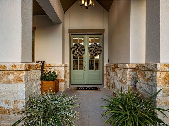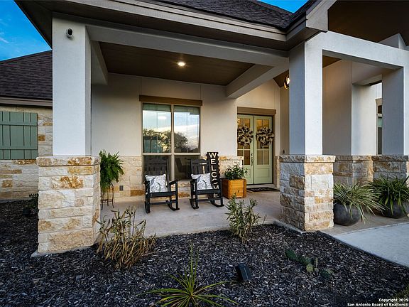 This exquisite Hill Country retreat offers the perfect blend of luxury, comfort, and convenience in a prestigious gated community. Set on an oversized lot that extends well beyond the fenced backyard, the property is surrounded by breathtaking scenery and offers exclusive park and river access-just minutes from one of Texas' most beautiful lakes. Thoughtfully designed with high-end finishes inside and out, it showcases exceptional craftsmanship throughout. As you step through the double door entryway, you're welcomed by soaring ceilings and a seamless flow into the main living areas. Inside, every detail has been carefully selected to enhance both style and functionality. The gourmet kitchen features granite countertops, a farmhouse sink, custom 42 inch Savannah cabinets, a wine bar, and sleek stainless steel appliances. Wide plank hardwood floors, a striking stone fireplace, and elegant high ceilings create a warm yet sophisticated atmosphere. Plush handwoven Berber carpet enhances the comfort of the bedrooms and upstairs retreat, making this home as inviting as it is refined. The spacious primary suite is a true retreat, complete with bay windows that flood the space with natural light. The spa-like en suite bathroom boasts a soaking tub, a walk-in shower, and dual vanities for ultimate relaxation. Guest bedrooms are generously sized with large closets in this predominantly single story floor plan. The open and airy layout provides plenty of space, including a bonus room upstairs, ideal for a guest suite or game room. Outdoor living is just as impressive, with a covered patio featuring a stone fireplace, an ideal spot for gathering with family and friends. The oversized three car garage offers plenty of storage, along with an 11-zone Rain Bird irrigation system and a water softener loop, ready for easy installation. With private Guadalupe River access and a community park, this home provides endless opportunities to experience the natural beauty of the Texas Hill Country while enjoying the finest in modern living.
