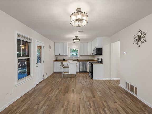 Step inside to discover an open, light-filled layout with luxury vinyl plank flooring throughout—durable, modern, and easy to maintain. The recently remodeled kitchen is a showpiece, featuring butcher block countertops, a natural gas range, white cabinetry, and stylish finishes that blend warmth with practicality. The kitchen flows effortlessly into the dining and living areas, creating an ideal setting for gatherings, movie nights, or quiet evenings at home.
