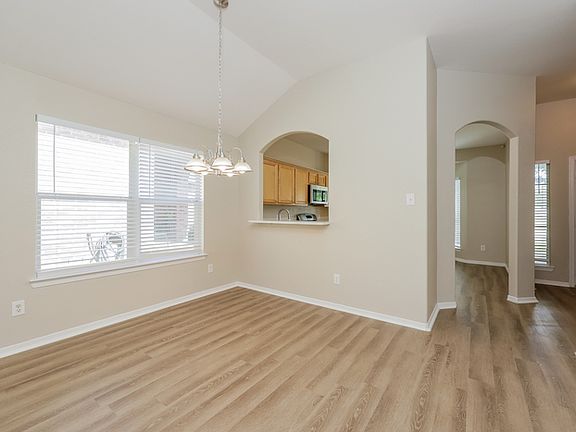 Step inside to a spacious living room with LVP flooring and vaulted ceilings, flowing naturally into the dining room and breakfast nook. The kitchen features stainless steel appliances, ample cabinetry, and a pass-through bar, making it both functional and welcoming. The primary suite includes a walk-in closet and double sinks, while two additional bedrooms and a second full bath add flexibility to the layout.
