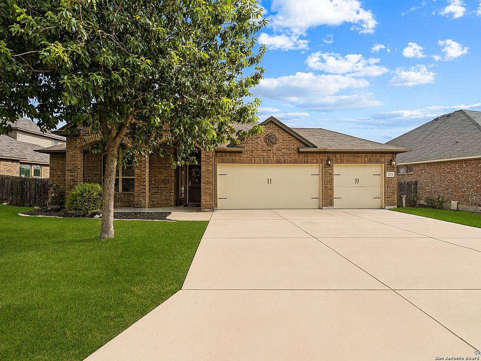 Pride of ownership shows in this beautifully maintained one-story Chesmar home by the original owner. Built in 2014, this 4-bed, 2-bath, 2,056 sq. ft. home sits on a .20-acre lot in New Braunfels with no mandatory HOA. Features include solid oak hardwood floors, arched entries, rounded corners, and a dining room with tray ceiling. The granite kitchen offers a breakfast bar and prep island, pendant & recessed lighting, tile backsplash, built-in desk, and stainless-steel appliances. Split plan primary suite with tray ceiling, large walk-in closet, and soaking tub + walk-in shower. Enjoy covered front and back patios, private views with mature trees, and a 3-car garage with epoxy flooring. Extras include sprinkler system, water softener, alarm wiring, faux wood blinds. Quiet location near downtown New Braunfels, Gruene Hall, medical, and shopping, with easy access to Randolph AFB, San Antonio, and Austin.
