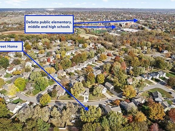 Sun-filled home, providing so many special features, has been freshly painted. You'll enjoy transom windows across the front and a full-size sliding door off kitchen to stream natural light. This beautiful home offers fabulous hardwood floors at entry, on staircase and in both kitchen and dining area; granite counters in kitchen and both upper level bathrooms; 7 years young HVAC; and the 50-year high impact shingle roof installed in 2019. Spacious primary suite provides two generous walk-in closets plus ensuite bath with tiled shower and private water closet. The finished lower level provides a generous rec room and third bathroom with brand new vanity. The crafter in your family will appreciate the extra deep garage with it's tucked in workshop space, built-in's and storage wall boards all stay with the home. You'll appreciate the ease of lawn care with your in-ground sprinkler system! Lovely treed lot backs to green space for added privacy, plus super convenient walkability - after a quick walk thru your fence gate and around the community fence, you're at Price Choppers grocery store, multiple restaurants and services, a liquor store, and more. You can walk to the post office and then grab a coffee from Starbucks and a pizza from Pizza Shoppe or a wrap from Twisted Fresh and you'll be ready for game time! Rather cuddle up with a great book? Walk across the shopping and dining area to the Shawnee library. Close proximity to acclaimed DeSoto schools, including Mill Valley High School, and several private schools. This neighborhood has its own playground and park, and a private trail to connect you to the county's renowned Mill Creek hiking and biking trail system. You'll love this community and your new home!