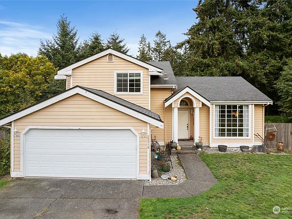 You'll love the huge back yard at this Saddlebrook neighborhood home. The treed landscape plus the county greenbelt along the back property line, provide seclusion from the two adjacent properties. A formal living room welcomes you as you enter this 3 bedroom, 2.5 bath home. The kitchen with dining area is open to a step-down, more casual living room with a wood-burning fireplace for added warmth on chilly autumn nights. One bedroom on the lower level. The primary bedroom w/bath & walk in closet, plus second bedroom suite also w/full bath are on the upper floor. Attached garage, wired for generator capability. Super convenient location, close to major shopping centers and an easy commute to Tacoma, Olympia and Seattle. No HOA.
