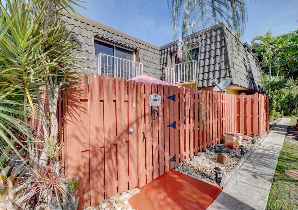 This charming townhome is waiting for you to make it your own! Private courtyard made for entertaining with concealed shed for extra storage on the side of the unit. New interior paint, ceramic tile, crown molding, updated ceiling fans, lever door handles, and new blinds. Kitchen has snack counter and pantry. Updated bathroom and shower with glass door, an imported sink from Mexico on first floor. Oversized sliders let in lots of natural light and expand your entertaining space. Hard wood floors on staircase and throughout second floor. Newer A/C and thermostat, complete set of hurricane panels, spacious master bedroom with wall to wall, floor to ceiling closets. Large secondary bedroom with built in bookcases, lots of closets and storage space. Upstairs bath has double vanity sinks with