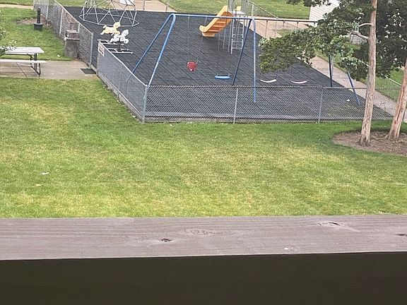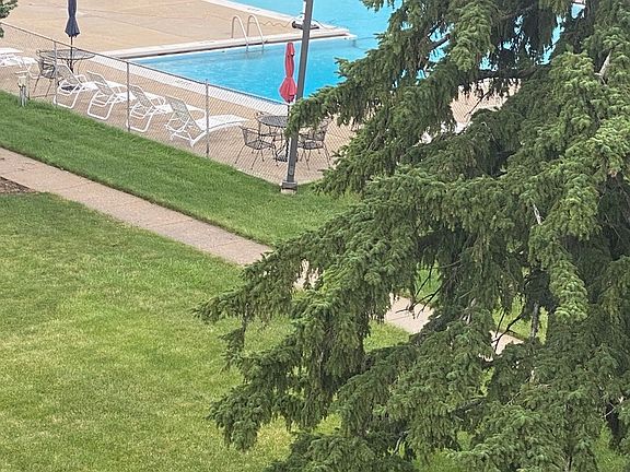 Welcome home to a beautiful 4th floor view overlooking the courtyard and sparkling heated pool. Large and spacious rooms and closets. This condo has laminate wood floors, a new quartz farmhouse sink, large windows, and new balcony. This corner end unit comes with 2 parking spaces and a basement storage unit. HOA includes water, heat, and pool. Laundry rooms are located on 2nd, 3rd, and 4th floors of the building. Call to schedule a showing today!