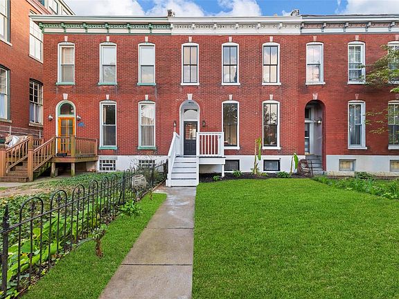Welcome to 2222 Sidney, a meticulously renovated, historic row home located in the roaring Benton Park neighborhood! Upon entry you are greeted by a covered entryway inviting you to an open, bright floor plan. Exposed brick, original staircase & recessed lighting gauges the eye. Living room & dining room are graced with space for entertaining. Kitchen is GORGEOUS: stainless steel appliances, quartz counters, tile back splash & center island perfect for gatherings. Off the kitchen is the finished 2 seasons room perfect for an office or private retreat. Dining area with fireplace & half bath wrap up the 1st FL. Upstairs you'll find the breathtaking primary suite with exposed brick, fireplace, double closet & bonus closet. The primary bath features double vanities & tiled shower/tub combo. 2 additional bedrooms, full bath, & laundry room complete the 2nd FL. Outside you'll find a fenced yard & 2 car garage! Revitalized & rehabbed with extreme care. Enjoy STL city living at it's finest.