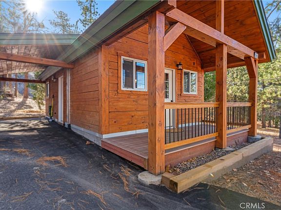 A handcrafted ladder leads to the cozy loft, filled with soft light. Down the hall, the main-level bedroom feels grounded and calm, complete with its own whisper-quiet mini-split—one of two in the home—for true year-round comfort.The bathroom blends rustic charm with artisan detail: an antique vanity topped with a hammered copper basin and a waterfall-style walk-in shower wrapped in deep mountain-green tile. A tankless water heater provides endless warmth, and a compact washer and dryer add ease for longer stays.Thoughtful upgrades include a hidden fire-suppression system, dual-pane windows, and a brand-new composition roof designed for winter snow. The covered carport and level driveway provide rare, reliable access through all seasons. Towering pines, granite outcroppings, and the gentle slope of the land give the property a timeless, quiet presence. From above, Arrowbear Lake shimmers like a mountain secret, the community nestled among evergreen ridgelines with Mount Baldy rising on the horizon. City water and sanitation, plus efficient propane for heating and cooking, blend modern comfort with natural simplicity. A newborn cabin in an old-soul forest—inviting, warm, and ready to become your mountain retreat.