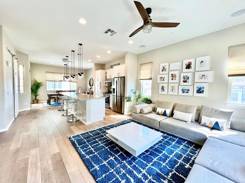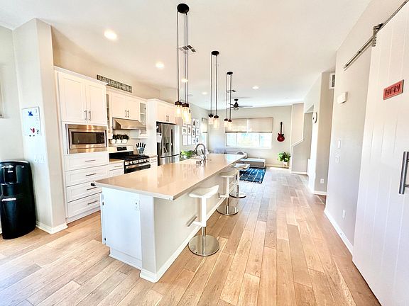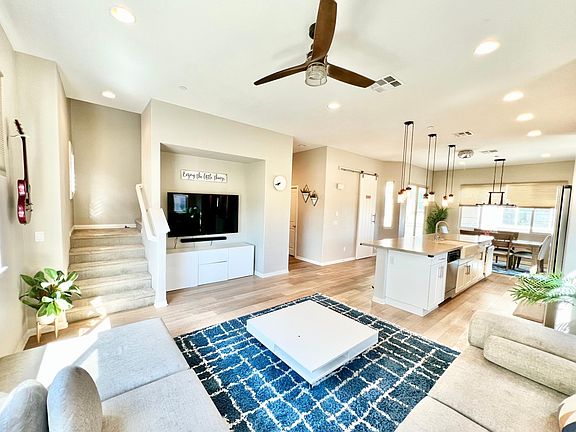 This Beautiful & Luxury condo has it all. Corner lot, open from 3 sides with 3 bedrooms and 3.5 bath. Built in 2017, upgraded to the max. Enter the first floor with direct access to 2 car garage which has lot of cabinets, overhead storage, office space, black & white boards on wall. One Bedroom on 1st floor with full bath perfect for Mother-in-law suite. Beautiful stamped concrete yard for BBQ, kids play, Spa or peaceful evening conversation time, done beautifully for everyday entertainment. Outside garage area is like cul-de-sac being corner house, great for kids to play. Second level is the heart of the home, you will find open concept kitchen, living space and dining room with large windows & Hardwood flooring. Kitchen has quartz countertops and huge island with farmhouse sink, Shaker cabinets, stainless steel appliances (comes with 4 door Samsung refrigerator) & a walk in pantry with Barn door. A convenient half bath and outdoor patio are also on the second floor making this a perfect layout for entertainment. On the third floor, you will find two master bedrooms, big bathrooms with dual vanities. Laundry is conveniently located on the third floor. Ready to Move-In from August 1, 2025. INCLUDED: Refrigerator, Washer & Dryer, other kitchen appliances, 3-Pendant lights in kitchen, Chandelier in dining, ceiling fans (except kids room fan), window coverings etc. Tenant responsible for all utilities payments. Tenant pays for all utilities & maintains landscape/plants. Rent due on 1st of each month. No smoking allowed inside the house. Small pets Okay.