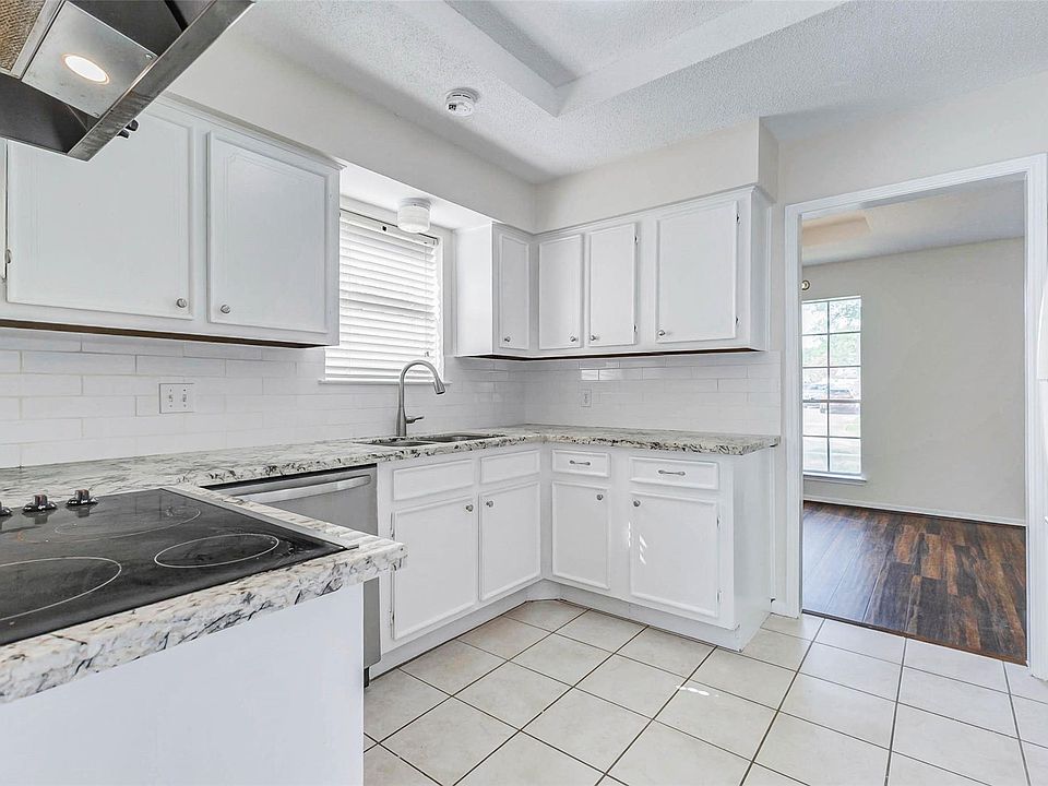 Lease this RECENTLY RENOVATED 4 bed, 2 bath home in West Memorial with FRESH PAINT (2023), KITCHEN UPDATES (2023), UPDATED FLOORS (2025)! Kitchen has crisp white cabinets, NEW granite counters, modern subway tile backsplash, double sink w/brushed nickel faucet, new electric cooktop & vent hood, double ovens, REFRIGERATOR! Kitchen opens to sunny breakfast room with beautiful bay windows. Living room features vaulted ceilings with wood beams & cozy fireplace. Large flex space at front of home could be a study, dining, or game room! Primary bedroom can accommodate king-size furniture suite & features en suite bathroom with granite counters! Three more bedrooms with wood laminate floors, secondary bathroom, & utility room with WASHER & DRYER included complete the space. Relax and unwind on the back patio after work and enjoy the spacious backyard! Easy access to I-10 and within walking distance of West Memorial Elementary and Junior High. Zoned to Taylor High School! No pets please.