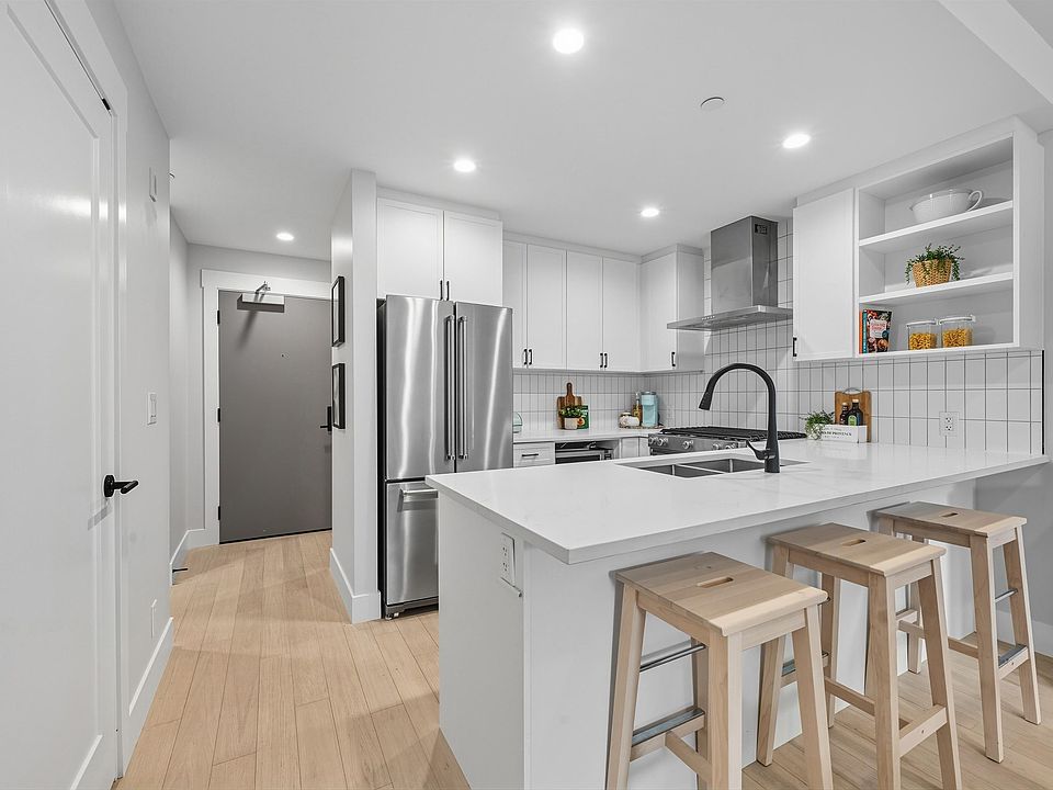Experience modern urban living in this bright and spacious 1-bedroom + den home, offering 655 sq.ft. of thoughtfully designed interior space in the heart of Maple Ridge. Features wide-plank engineered hardwood floors, large windows, and a modern kitchen with full-size KitchenAid appliances, quartz countertops, and a breakfast bar. Stay comfortable year-round with AC and heating via an energy-efficient heat pump. Includes 1 parking stall and 1 storage locker. Pet-friendly building with premium amenities: Rooftop garden and kitchen/lounge for entertaining, a fully-equipped gym, landscaped courtyard, and kids play area. Steps from cafés, shops, parks, and Maple Ridge Leisure Centre.