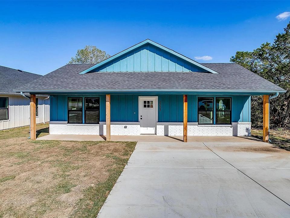 New construction craftsman home located just minutes from the Granbury Square. The exterior of this 3 bedroom 2 bath home features a combination of board and batten siding and brick with an oversized front porch. As you enter, you are greeted by an open concept living and kitchen area. Large windows allow ample natural light to fill the space, creating a bright and airy atmosphere.