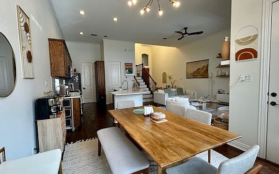 Beautifully updated, this two-story home combines style, comfort, and privacy with its own yard. A gated patio leads to a vaulted foyer with soaring ceilings on the first floor. Hand-scraped hardwood floors and plantation shutters create a warm, inviting feel, while abundant natural light can be easily adjusted for comfort. The kitchen is a chef's delight with Quartz countertops, stainless steel appliances, and designer lighting. Upstairs, you'll find three bedrooms and a flexible office nook. The renovated primary suite features dual sinks, a spacious walk-in closet, and a private balcony. The backyard is thoughtfully finished for both relaxation and entertaining. Added conveniences include a washer, dryer, refrigerator, and a Tesla charger in the epoxy-finished garage.