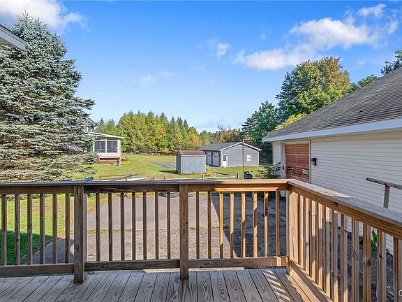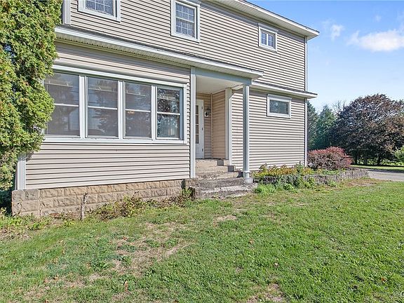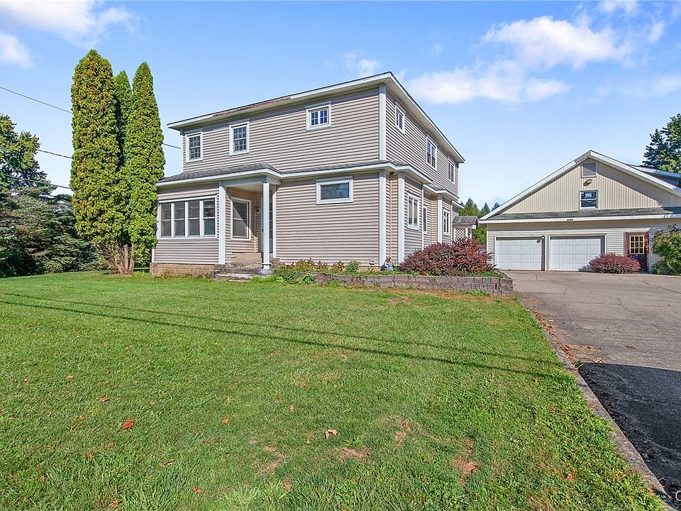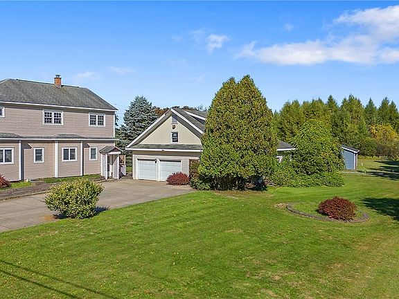 STURDY, STRONG AND LOVED THIS SPACIOUS COLONIAL SITS ON ALMOST AN ACRE AND OFFERS ALL THE SPACE ANYONE WOULD EVER NEED AND STILL HOLDS SOME CHARM AND CHARACTER OF DAYS GONE BY.....UPDATES HAVE BEEN ADDED OVER THE YEARS. BEAUTIFUL HARDWOODS THROUGHOUT MOST OF THE HOME*SPACIOUS LIVINGROOM WITH FIREPLACE*FRENCH DOORS FROM THE LRM LEAD TO THE SUNROOM*FORMAL DININGROOM*DEN W/BRICK WALL FRPLC WITH ACCESS TO THE PRIVATE DECK*KITCHEN OFFERS GREAT STORAGE + ALL APPLIANCES & A PANTRY*1ST FLOOR BEDROOM WAS CONVERTED TO A LAUNDRY (WASHER/DRYER STAY)***EXQUISITE OAK STAIR CASE TAKES YOU TO THE SECOND FLOOR WHERE YOU WILL FIND 4 GOOD SIZE BEDROOMS PLUS AN OFFICE AND A SPACIOUS SPA BATH COMPLETE WITH A JETTED TUB, RECESSED LIGHTING, BIG VANITY AND TILE FLOORING**HARDWOODS AND OAK TRIM SHOWCASE THESE ROOMS*EFFICIENT IN FLOOR HOT WATER MULTI ZONE HEATING THROUGHOUT THE HOME. MANY WINDOWS HAVE BEEN REPLACED.....ABUNDANT GARAGE SPACE....3 BAYS PLUS A WORKSHOP**ADDIIONAL STORAGE AND A 2ND FLOOR LOFT AREA THAT HAS SO MANY USES THINK "STUDIO", GARAGE IS PLUMBED FOR A BATH ALSO. THERE IS A 200 AMP UNDERGROUND ELECTRIC SERVICE THAT SERVICES THE HOME AND GARAGES....THERE IS ALSO A SPRINKLER SYSTEM ON PART OF THE LAWN AND IS TURNED OFF BUT HAS NOT BEEN USED IN A FEW YEARS. GATHER YOUR DECORATING IDEAS AND LET THE FUN BEGIN IN MAKING THIS GEM YOUR NEW HOME! GREAT COUNTRY LOCATION YET CLOSE TO AUBURN AND 35 MINUTES TO SYRACUSE. THIS HOME IS IN GOOD CONDITION HOWEVER BEING SOLD IN AS CONDITION......