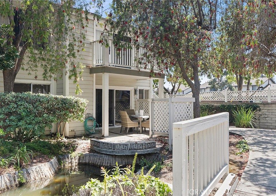 You'll love the abundant natural light and spacious rooms throughout—even the indoor laundry area has its own storage. The cozy living room features a warm gas fireplace and opens to a private patio overlooking a lush water feature, perfect for relaxing or entertaining.