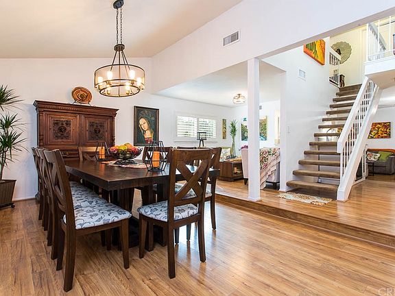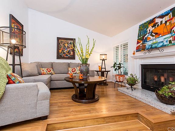 For a private showing call Christina at 805-200-6229. Imagine a home that makes you feel like you are on vacation every day. Starting through the walled gated entry into a relaxing covered patio, with red Spanish tile and a soothing water fountain, next you step up to a solid wood, Speakeasy style, front door that welcomes you into the beauty of a bright and open floor plan decked in rich laminate wood flooring and plantation shutters throughout. To your right a step up living room with fireplace, to your left a large dining area with seating for ten, plus a separate step up sitting room. The entry continues through a newly remodeled kitchen and wine bar, and into a very large step down family room located next to the kitchen. The family room presents the ideal connection of the all marble kitchen counters and the food counter large enough to seats four, and allows your favorite chef to entertain company while cooking, as well as leading to your attached two car garage, and enclosed pantry and laundry room. The remodeled kitchen and all three bathrooms are tastefully done with travertine tile floor, upscale faucets and modern cabinetry. Upstairs you will find carpet throughout the three bedrooms, an office, with laminate wood floor, that if preferred may be converted back to a fourth bedroom. The large master bedroom opens to a covered balcony with views of tall palm trees, a courtyard to the south, and your own covered patio to the west.
