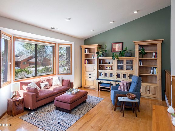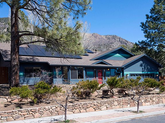 This stand-out single-level home has been thoughtfully situated on a.37-acre double corner lot , steps away from hiking trails. Over the years, Harmony Builders/ Kevin Baltzell completed several remodeling projects to reimage this home. Three bedrooms split layout, w/ office, front foyer/mudroom, large great room concept, and additional laundry mudroom off the garage entrance. You will say ''WOW'' with all the attention to detail: custom wood doors and windows, maple hardwood floors in all the main living space and bedrooms, fresh paint inside and out, fully owned solar panels, updated mechanics (tankless water heaters and heat pump), skylights, solar tubes, and A/C make this home truly special. The sunken living room features maple built-in shelving and LED lighting, while the kitchen features Alder cabinets with plenty of space for entertaining guests. The family room has a sandstone wood fireplace. The renovated primary bathroom with a custom walk-in closet (heated tile floors) is the perfect retreat. There's a charming custom playhouse in the backyard, extensive landscaping, mountain views, and a double gate off the cul de sac for your toys. Don't miss your chance to own this one-of-a-kind Flagstaff property!