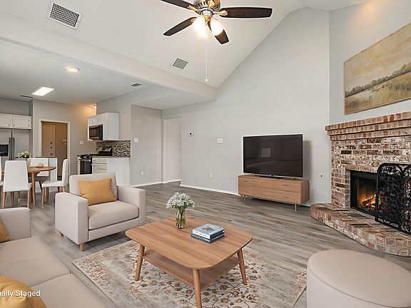 Brick fireplaceHardwood floorsSeparate dining nookThree bedroomsOpen kitchen