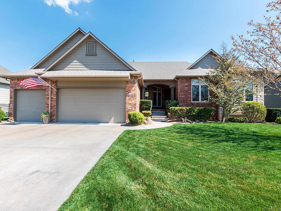 Nestled on the sought after Derby Golf and Country Club, this masterpiece has been maintained with excellent care. A beautiful home that features 5 bedrooms, 3 full baths, 3 car commercial grade insulated garage with epoxy flooring and over 4,000 finished SF. The inviting and open floor plan features a living area with vaulted wood beam ceilings, floor to ceiling windows for natural sunlight, and a gas fireplace with custom built shelving. The spacious kitchen has plenty of storage space, a large center island bar with granite countertops, and a gas oven/range. Elegant lighting in the formal dining room showcases the custom built in cabinets and woodwork throughout. This split bedroom ranch has a master with tray ceilings, large walk-in shower, soaker tub, double sink vanities, bidet, and a large walk-in closet. Two more bedrooms with a full bath complete the main floor. New carpet leads down to the basement and the view of the course continues with a walk out patio equipped for a hot tub, a large rec room, 2 additional bedrooms, a full bath, wet bar with new flooring and a family room with a 2nd fireplace. Under the stairs could be finished out for a kids reading nook and is wired for lighting. This home has many updates including: new carpeting in the basement, new flooring in all of the bathrooms, commercial grade insulation with epoxy flooring in the garage, new roof/gutters in 2022, and basement outlets have been wired with led nightlights. All special taxes are paid off! Conveniently located near many walking/jogging paths, one mile from Derby shopping and 5 miles to McConnell Air Force Base. This home offers a gorgeous outdoor living area with a covered deck that overlooks the 11th hole with amazing views of the course. Don't miss the opportunity to own this beautiful home. Sellers have an assumable VA loan with a low interest rate which can transfer to buyer! Listing courtesy of Epic Homes ICT brokered by EXP Realty, Vanessa Kennedy and Kevin O'Hara.