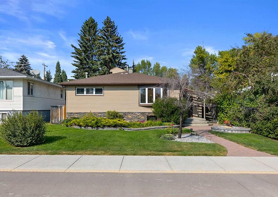3,138 TOTAL SQ.FT. | 5-BED | 2-BATH | DETACHED GARAGE | CUSTOM ADDITION | VAULTED LIVING ROOM | RENOVATED KITCHEN | A/C | METICULOUSLY MAINTAINED | This isn’t your typical bungalow! An impressive rear addition and high-end upgrades sets this Banff Trail home apart from the rest. The vaulted great room is filled with NATURAL LIGHT from west-facing windows, anchored by custom built-ins and a wood-burning fireplace with gas starter. A renovated kitchen with quartz counters, premium appliances and cabinetry flows into a large dining area ready for entertaining. Skylights in the entry, kitchen, and main bath brighten key areas, and the updated bathroom with HEATED FLOORS offers direct access to the primary bedroom. Two additional bedrooms round out the main level, while the lower floor adds a family room with wood burning fire place, versatile rec space with WET BAR, two bedrooms, full bath, and abundant storage. Upgrades include KINETICO WATER FILTRATION, NEW SEWER LINE (2023 with warranty), SPRINKLER SYSTEM, Telus security, air conditioning, and a detached double garage. With schools, parks, LRT, U of C, and Foothills Hospital all nearby, this home combines character, modern upgrades, and inner-city convenience. An opportunity this special doesn’t come along often, and it won’t last long.