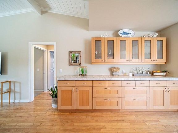 This charming two 2 bedroom, 1 bath home offers a spacious open floor plan. The living room welcomes you with vaulted ceilings& finished hardwood floors leading to an upgraded kitchen. Pull a stool up to the stainless island counter and chat with the chef or take a seat in the large built-in breakfast nook. An adjacent wall of built ins offers a buffet for entertaining, lots of storage, a pantry and a desk for your in house office. A slider then leads to a porch giving access to the two car garage and laundry. It also opens to a large back yard with a built in BBQ, sitting area, and built in fire pit. Mature tall trees line the back wall for additional privacy to this wonderful entertaining space. Tenants are to pay for gas and Electricity