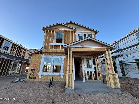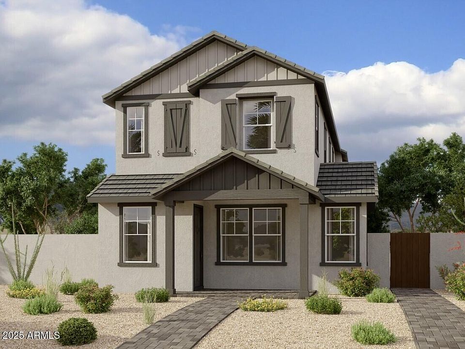 Ridgeline home plan with 2052 square feet on 2 levels with 3 bedrooms and 2.5 bathrooms and a 2 car garage. The exterior features Farmhouse style elevation, Pavers at the covered front entry and gas BBQ stub at side yard. Interior features 9' ceilings & 8' doors, open concept with stainless steel GE appliances including an under-cabinet hood, a built-in gas cooktop with five burners, and a built-in wall oven and microwave with trim kit. White painted shaker style cabinets with champagne bronze hardware, calming white mosaic backsplash, and quartz kitchen countertops. 6x36 wood-looking tile through the main level and in wet areas on 2nd level, primary bath to include 14x16 White Hex tile. Upgraded carpet and pad throughout. Electrical and low voltage upgrades to include flat screen ready recessed in wall TV Box, separate switch prewire for pendant lights above the kitchen island and prewire for ceiling fans in bedrooms. The garage is pre-plumbed for a sink and will also offer a 50A/240V outlet for electric vehicle. Union Park offers Tree-lined streets, pedestrian-friendly sidewalks and a 5,500 sf recreation center with a resort-style pool and kiddie pool, shaded ramadas, parks, gathering areas, pickleball courts and basketball. Close to I-10, 101 and 303. Walking distance to restaurants, movies, entertainment and shopping.