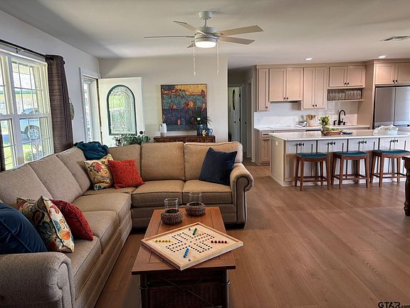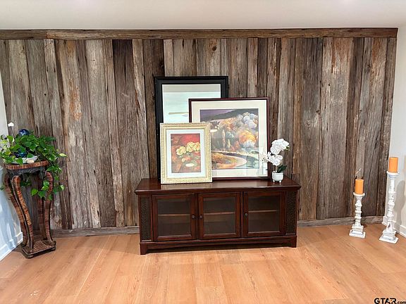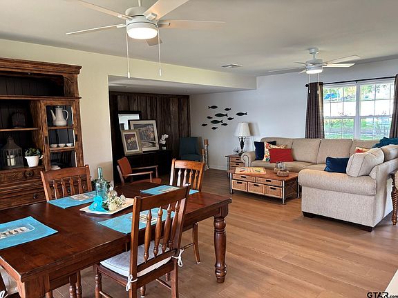 Your search is over---this completely remodeled three bedroom, two bath waterfront home on Lake Palestine is a gem! Enter to mesmerizing views of the lake that can be seen from the spacious living room, updated kitchen and primary bedroom with en suite bath. All new two tiered covered and open decking allows you to dine in or outside enjoying the water view. You will appreciate the Interior Designer touches in the dream kitchen with abundant storage, a huge gathering island and a coffee bar, along with other special strokes throughout the house including sliding barn style doors as well as an accent wall in the living room constructed from reclaimed wood from an historic home in Nacogdoches from the 1800's. Sitting on two lots at the end of the neighborhood you have everything you hoped for in waterfront property, fabulous views, two lots, a fenced yard, two workshops with electricity and two boathouses. Imagine your family and friends enjoying the slide and diving board at the boathouse along with a stainless steel fish cleaning station and a designated fishing area to cast freely. 6-7' water depth and a great bass and crappie fishing location as well! Enjoy both the sunrises from the east and the sunsets from this great location on the north bank of Highsaw Bay. Call for your private viewing now and enjoy lake style living soon!