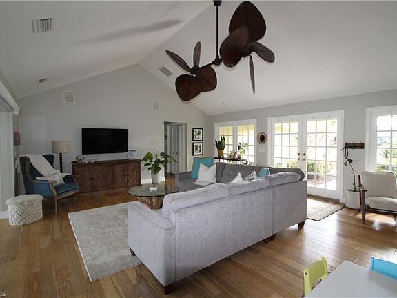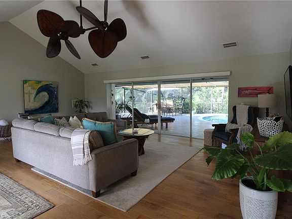 Beautiful, move in ready home in Imperial Golf Estates. This 3 bedroom 2 bath home provides a tropical oasis on the outside and wonderful charm on the inside. You are welcomed by the palm trees and invited in by the french door style windows as you approach. The natural light shines throughout and the patio is an extension of the house. Beautiful wood floors, updated kitchen with brand new appliances, brand new light fixtures, plantation shutters throughout, water softener and reverse osmosis drinking system. This home is situated on an oversized corner lot with lush privacy landscape surrounding the home and patio. Enjoy double the living space with the oversized screened in patio and covered lanai. This home was made to entertain with its wonderful flow; expansive pocket slider doors from kitchen, living area and master bedroom. Gorgeous sunsets and lake views beyond the patio. Established gated community with low HOA fees and 2 separate entrances for residents to access neighborhood from US41 and Livingston. Membership to Imperial Golf Club is optional.