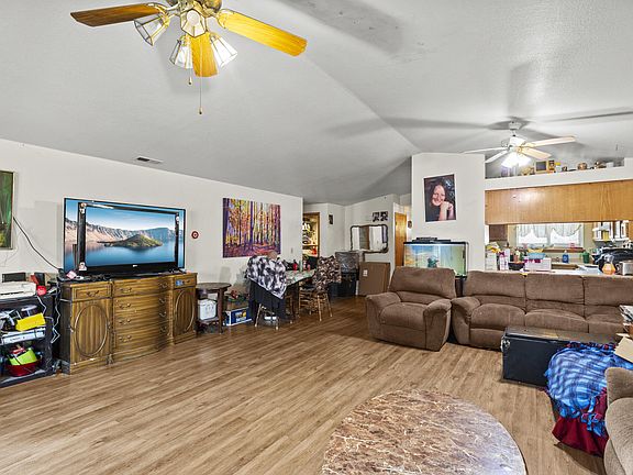 Inviting home in the desirable Lower River Meadows neighborhood. The spacious living room has vaulted ceilings, three large windows letting in lots of natural light, and an exterior door leading to a covered patio that's perfect for indoor-outdoor living. The kitchen features lots of cupboard space, a free-standing fridge and a convenient pass-through to the living room, while the adjacent dining area makes entertaining a breeze. The private primary suite includes a walk-in closet and ensuite bath for your comfort. Two additional bedrooms, a full bathroom with a tub/shower combination, and a dedicated laundry room provide functionality and convenience. Step outside to the fully fenced backyard with a covered patio, ideal for relaxation or gatherings. Located near restaurants, shopping, parks, Rogue Community College, and the Grants Pass Golf Course. *New roof last year.