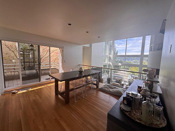 Soaring two-story, floor-to-ceiling windows that fill the open-plan living, dining, and kitchen areas with natural light and showcase sweeping views of Lake Union, the Olympic Mountains, and the Space Needle .
