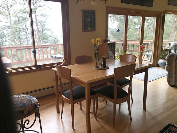 Mountain Contemporary Home on gentle acreage with expansive wilderness vistas!Nestled at the foot of Mt. Bailey, featuring 180 degree views of Pike National Forest, it is a true mountain getaway. This modern custom built home sits on a private pine-scented lot with over 5 acres of usable land, wildlife and unique rock outcroppings! A generous 3,000 square feet, built in 1993 and extensively upgraded over the years. Open floor plan design connects the large and relaxed living area with a designer kitchen featuring Hickory cabinetry and Red Oak floors. Soaring vaulted ceilings,large windows, skylights open the rooms to refreshing sunlight and air. The lower level would make an ideal rec room! Large multi-level decks showcase the Rocky Mountain splendor and even city night lights of Bailey! Perfect for entertaining or a just a peaceful cup of sunrise coffee! Well maintained county roads, strong internet access and conveniently close to 285 and Denver makes this a fit for all lifestyles.