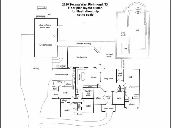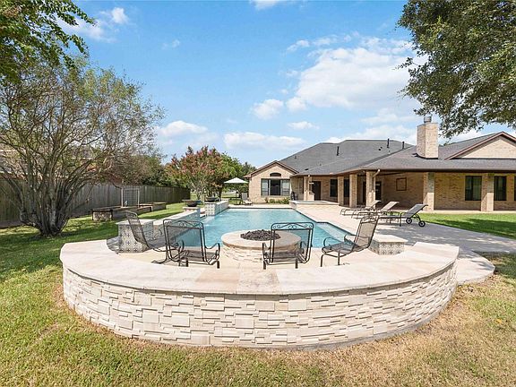 Beautifully updated 5,087 sq. ft. Four-bedroom, four-bath one-story brick home built by Sierra Classic Homes, Inc. in Texana, a gorgeous & sought-after gated community in Fort Bend County, TX. The current owners remodeled, expanded & heavily updated the home in 2019 including new flooring, interior paint, counters, backsplash, appliances, pool/spa/gas fire pit/outdoor cooking, custom drapes & valances, tile & fixtures in 3 bathrooms, beautiful large stained glass window in primary bath, new AC compressors, & adding on a new junior primary bedroom & bath, & semi-detached two-car garage with an office or game room. Excellent 1-story floor plan for comfortable family living & entertaining with good parking space. The kitchen & utility space can support catering a good-sized party & the outdoor space is comfortable for entertaining large or small groups. There is a 12x25 concrete pad in the back for parking a trailer. This home has no history of flooding, & did not flood during Harvey.