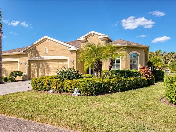 The popular Magnolia model is the largest in the desirable neighborhood of Nottingham, with over 1860 sq ft including three bedrooms plus a den located on the first hole of Ibis golf course. This is an exceptional floor plan with a front entry, beautiful foyer, and tray ceilings throughout, including the living/dining and master suite. The kitchen is U-shaped with 42 inch wood cabinets, granite countertops, breakfast bar and under cabinet lighting. The master suite has two walk-in closets with organizers, double vanity and large shower. The laundry room has a front load stainless steel washer and dryer on pedestals, and cabinets that match the rest of this beautiful home. The windows are covered with plantation shutters. This beautifully landscaped home comes with hurricane shutters and in-wall pest control. It is located in Kings Point, a 55 plus, security gated, golf cart community located between Tampa and Sarasota. Your golf cart becomes a second mode of transportation and is used to reach the clubhouses, fitness centers, pickleball courts, pools and over 200 clubs that Kings Point has to offer. In addition, you are able to access grocery stores, pharmacies, restaurants and physicians. Easy entry onto I-75 allows access to airports, beaches, shopping, dining and entertainment. This is an amazing home in impeccable condition.