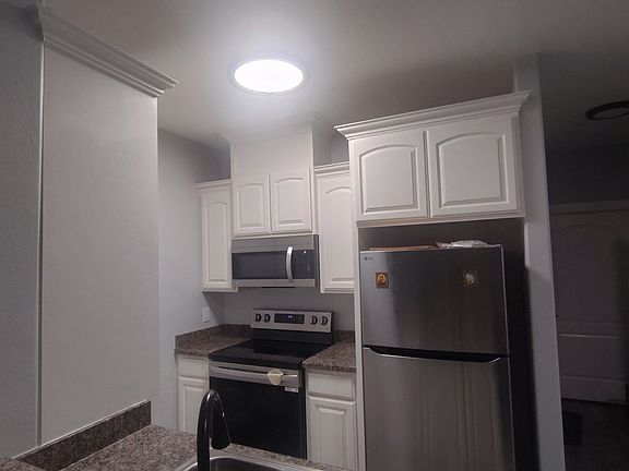 Granite countertops and stainless steel appliances (refrigerator, stove, and microwave) included.